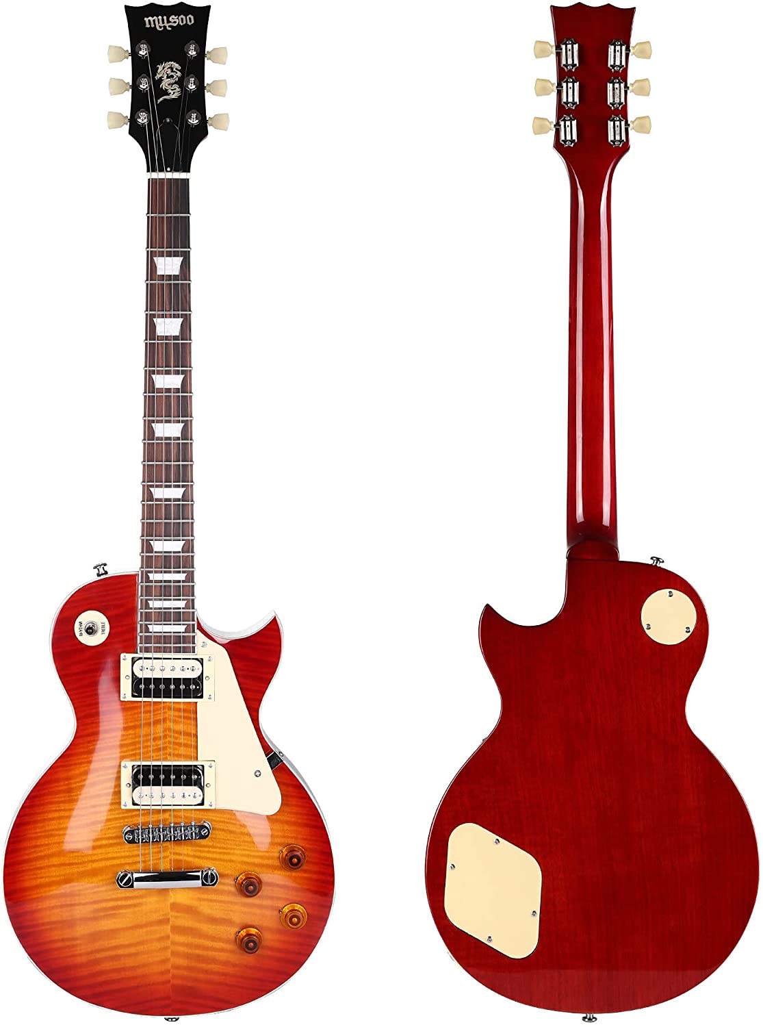 【Excellent Material 】The les paul style guitar eatures a comfortable Mahogany body and paint flame maple venner, rosewood fingerboard with white mother of pearl inlay for guitar fingerboard.